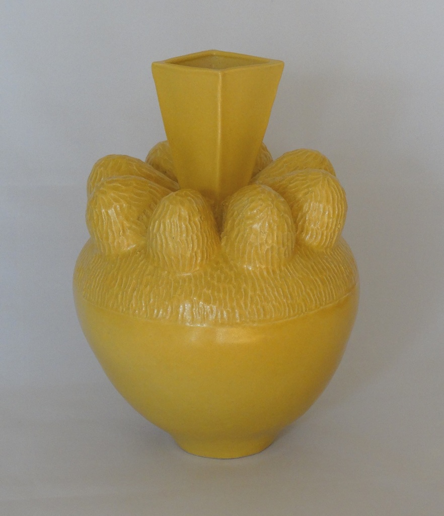 Vaasvorm, handgevormd, geel geglazuurd aardewerk.