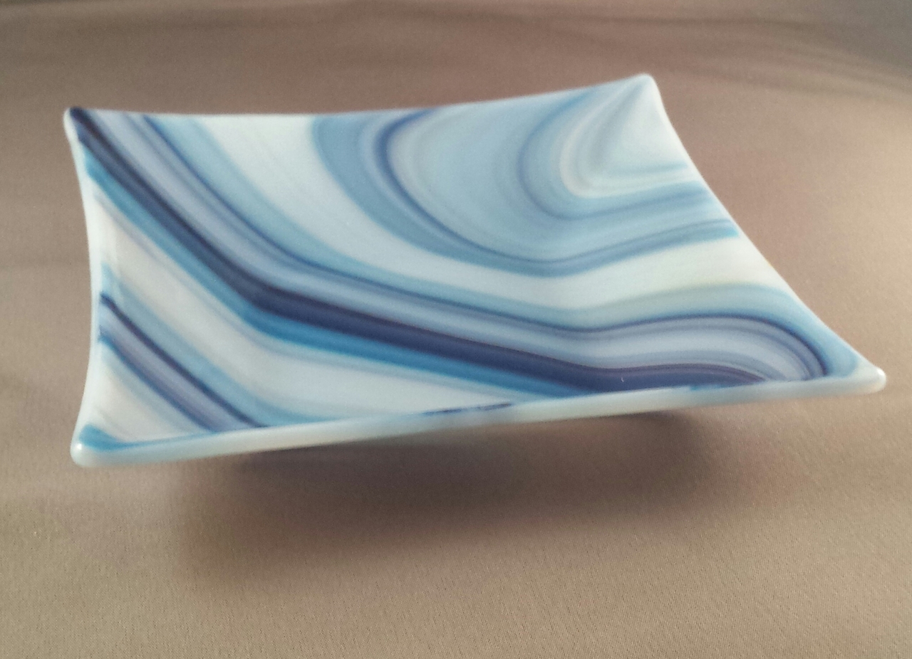 Schaaltje van blauw en wit gekamd glas.