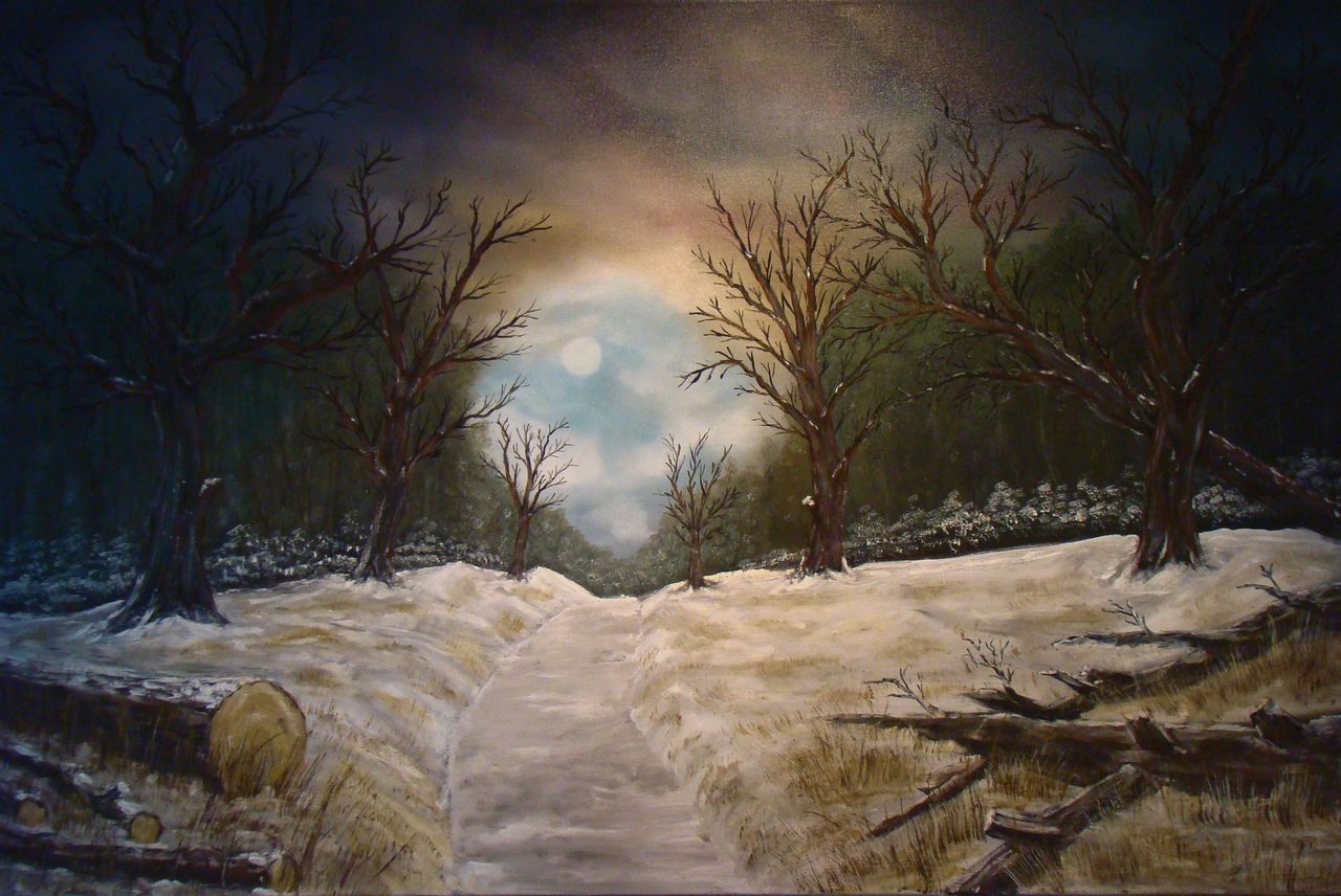 Landschap Olieverf Sneeuw Nacht Maanlicht