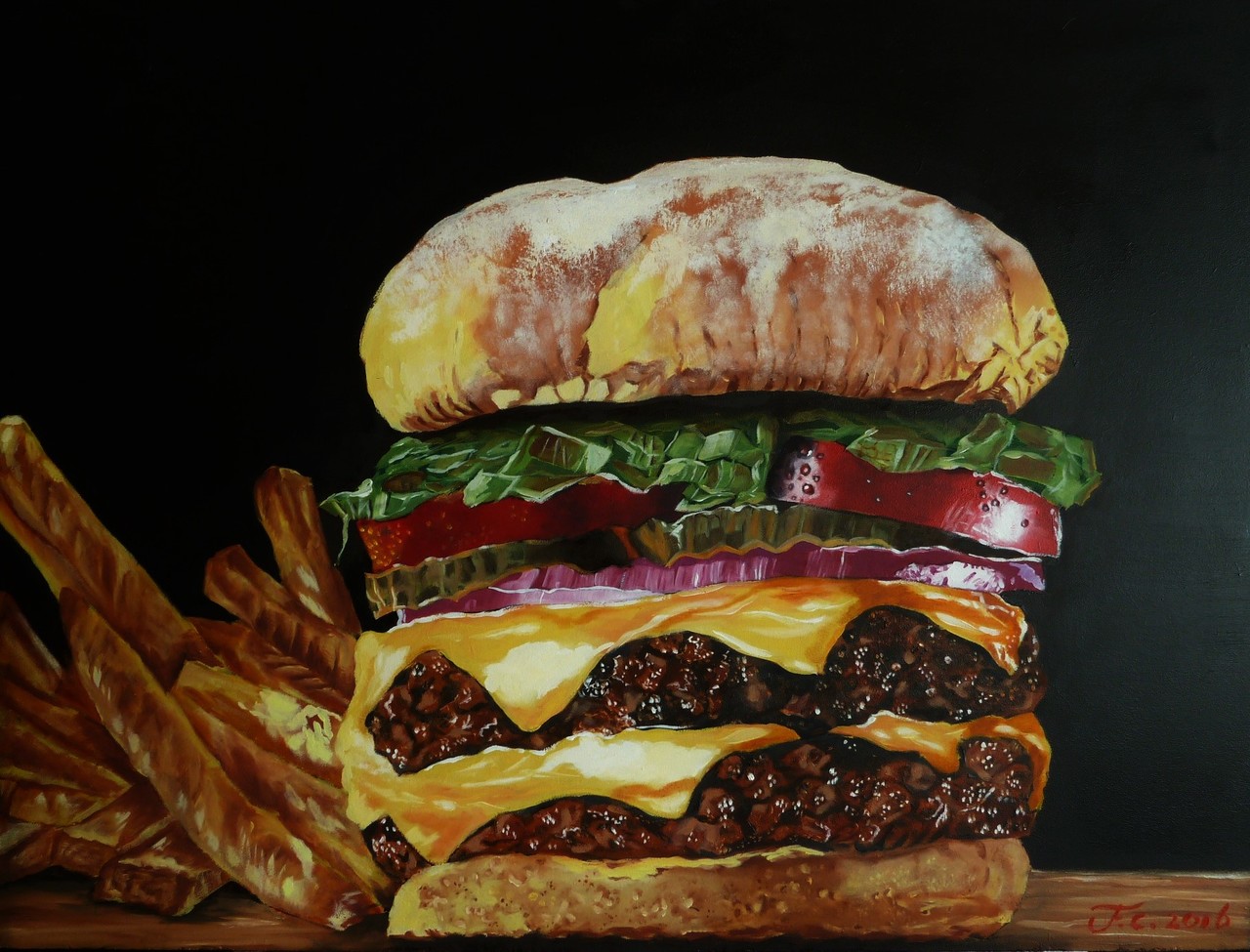 Rood Geel Zwart Kleurrijk Eten Food Broodje Smakelijk Dubbel Hamburger Patat Cheese Ongezond Popart