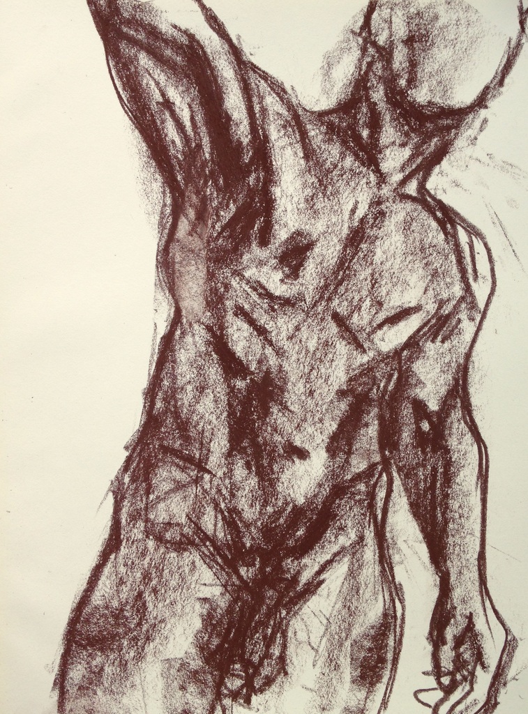 Mannelijk naak gezien van voren met opgeheven arm.