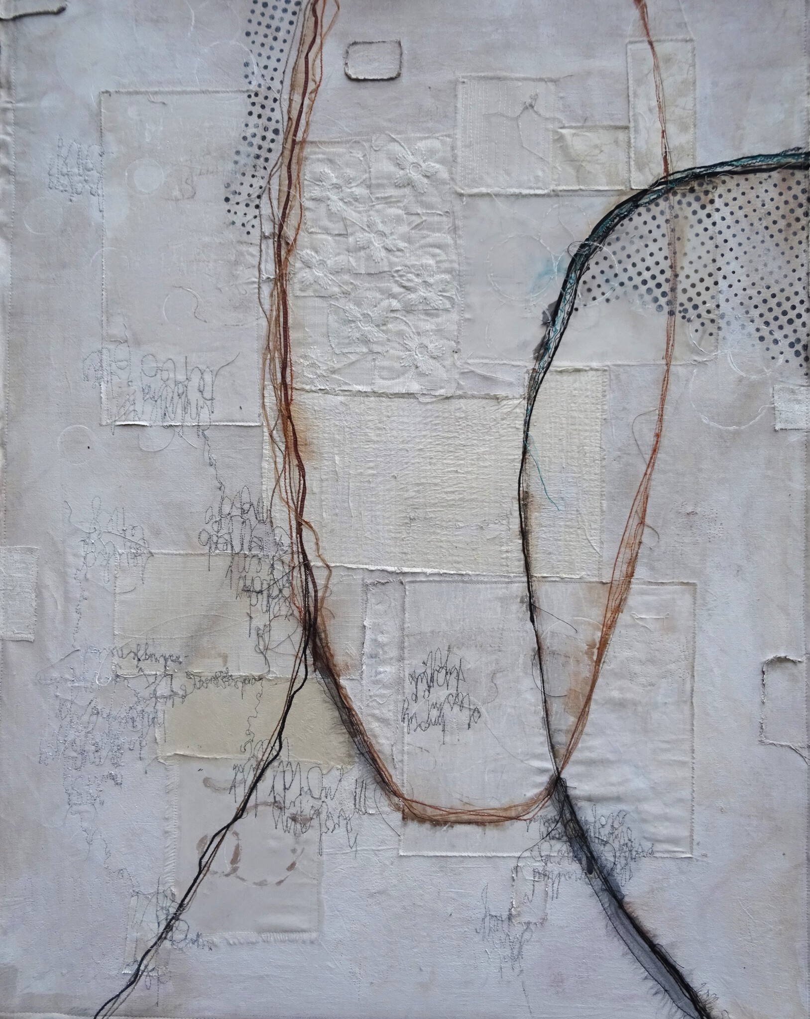 Menselijke verbinding. Gemaakt in mixed media o.a. verf, stof, papier, vrij machinaal borduurwerk.