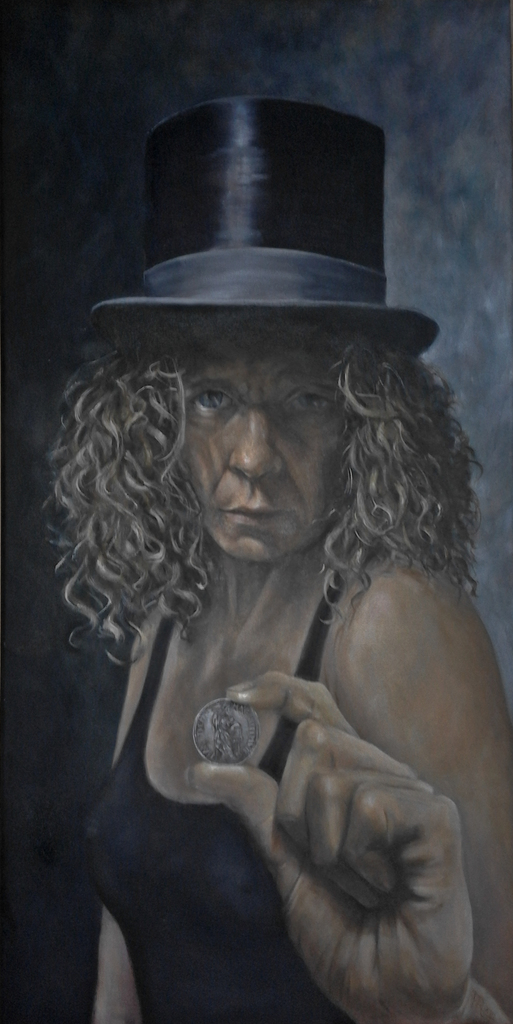 Selfie met geld. Kijk ! Besef wat geld met ons doet. De munt is een statenmunt met de hollandse maagd die de vrijheidshoed hoog heeft zitten. De tekst : HAC NITIMVR HANC TVEMVR betekent vrij vertaald ; op haar steunen wij, haar beschermen wij.