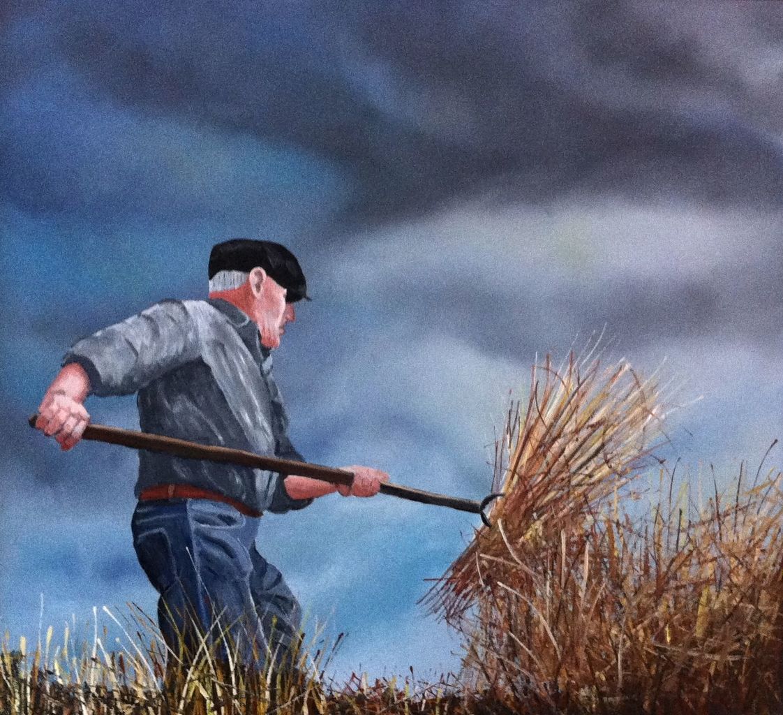 Juli Het graan moet van het land Alles doet hij met de hand Een echt buitenmens Want dat was altijd zijn wens