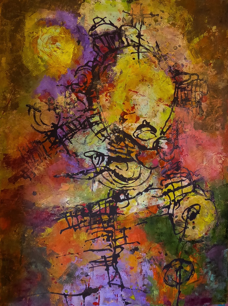 Abstracte schilderijen en dito beschilderde objecten in een stijl die ligt tussen geraffineerde eenvoud en georganiseerde chaos