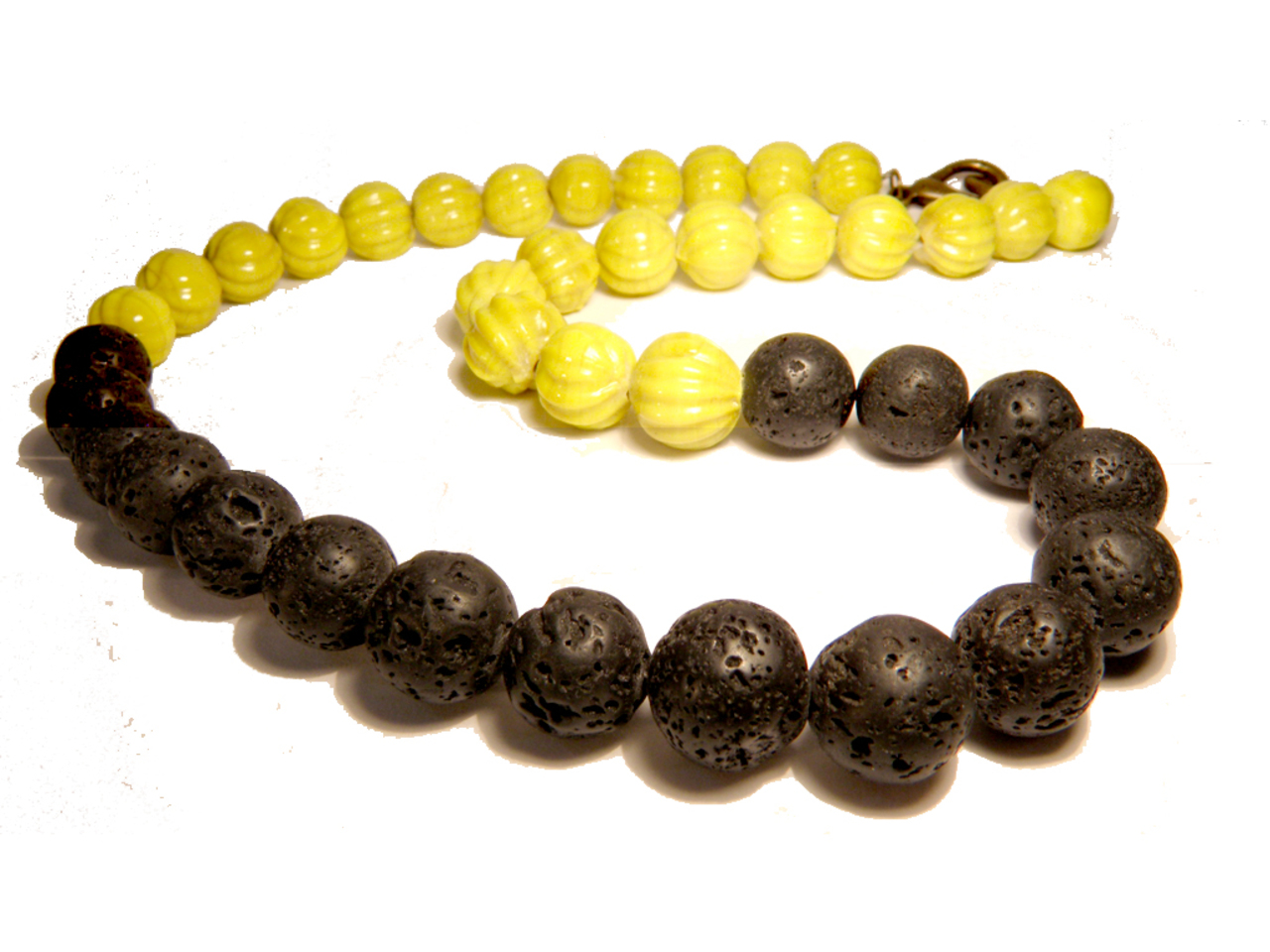 Zwarte kralen zijn lava, de gele kralen van glas.