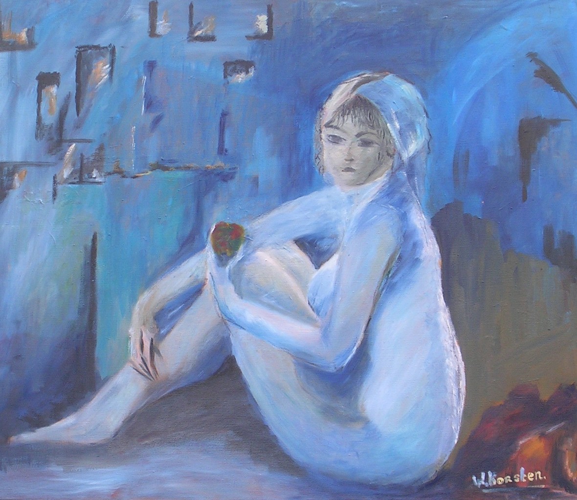 Zittend naakt met appel.