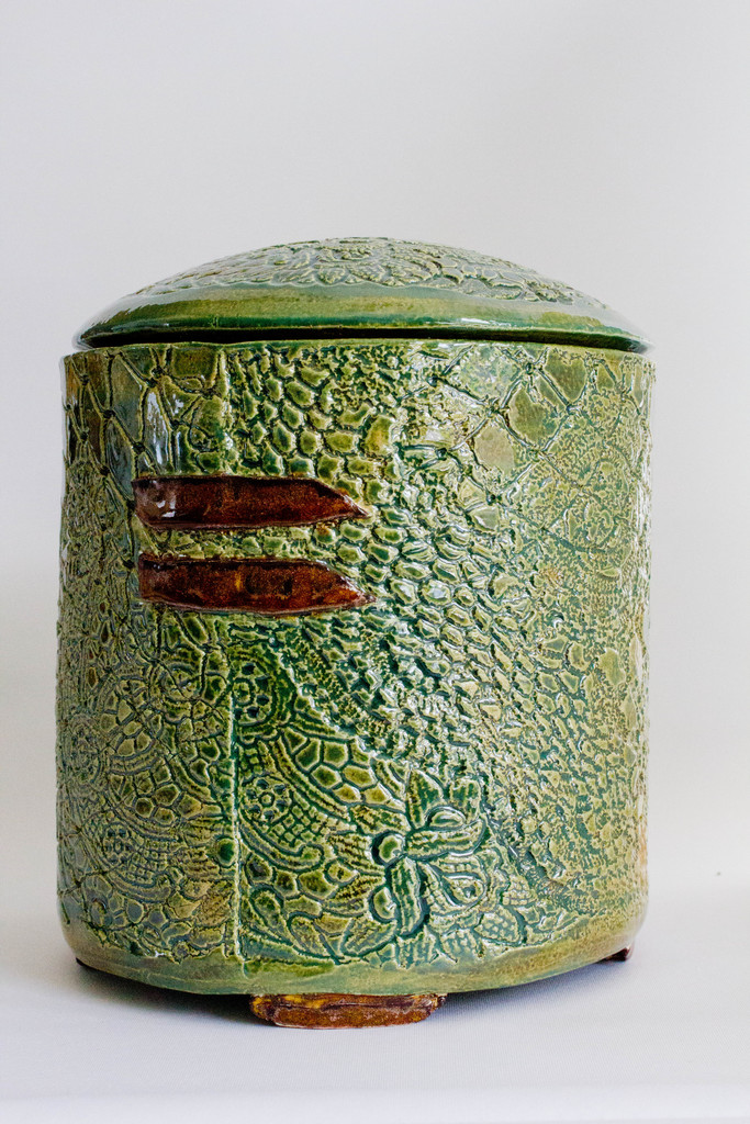 Gemaakt van witte Creaton klei, ingewassen met mangaan en afgewerkt met kleur glansglazuur.