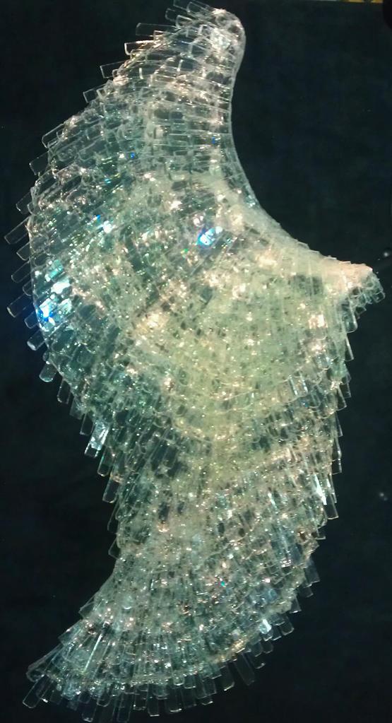 Sculptuur van zorgvuldig geselecteerde en gepolijste glazen deeltjes waarin led verlichting op door middel van glasvezel is verwerkt.De verlichting is op verschillende manieren regelbaar. Deze sculptuur is zoals op de foto te exposeren maar kan ook aan de wand worden bevestigd. Bij de getoonde linkervleugel hoort ook een rechtervleugel, de onderstaande prijs is voor beide vleugels.