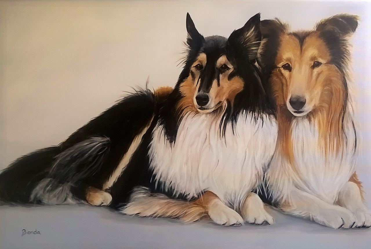 Twee geliefde Collies geportretteerd in opdracht. Acryl op doek.
