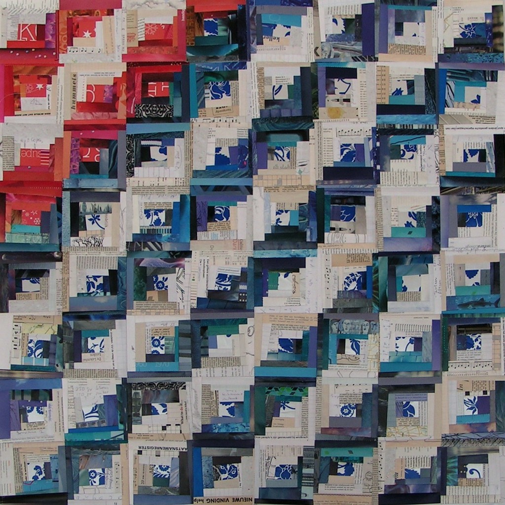 Collage, log cabin patroon (quilt-patroon) delen aan elkaar gestikt.