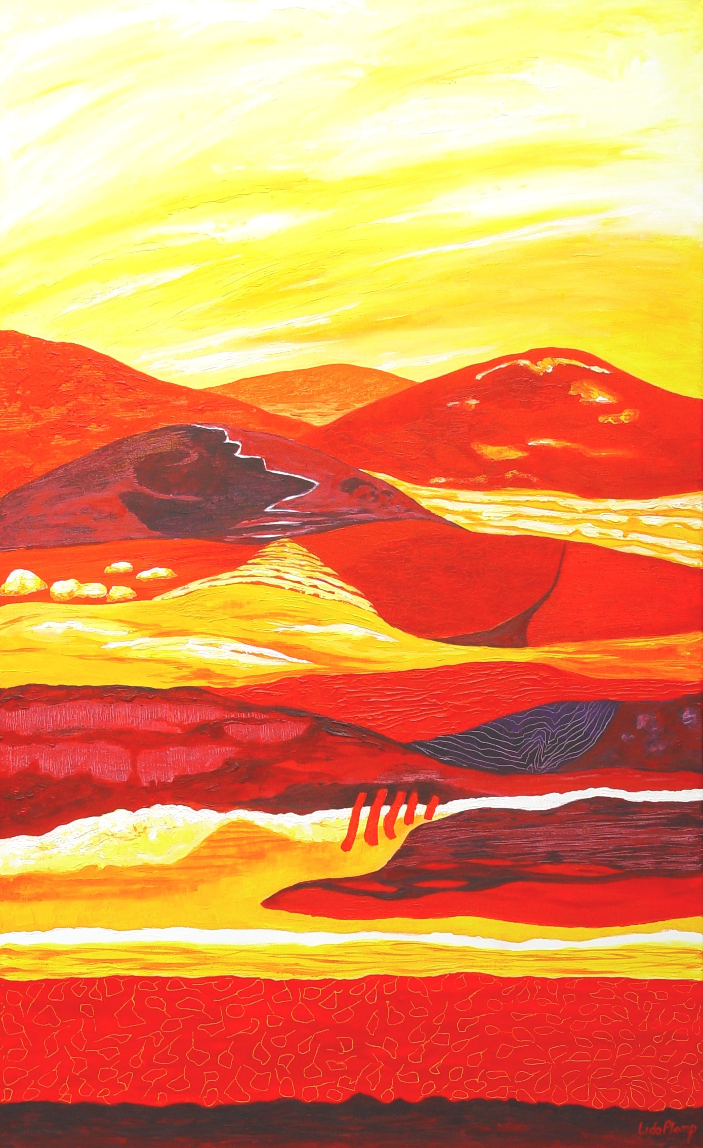 landschap rood is opgebouwd uit verschillende roodtinten, daarbij is ingekrast en gedeeltes zijn dik opgebracht.