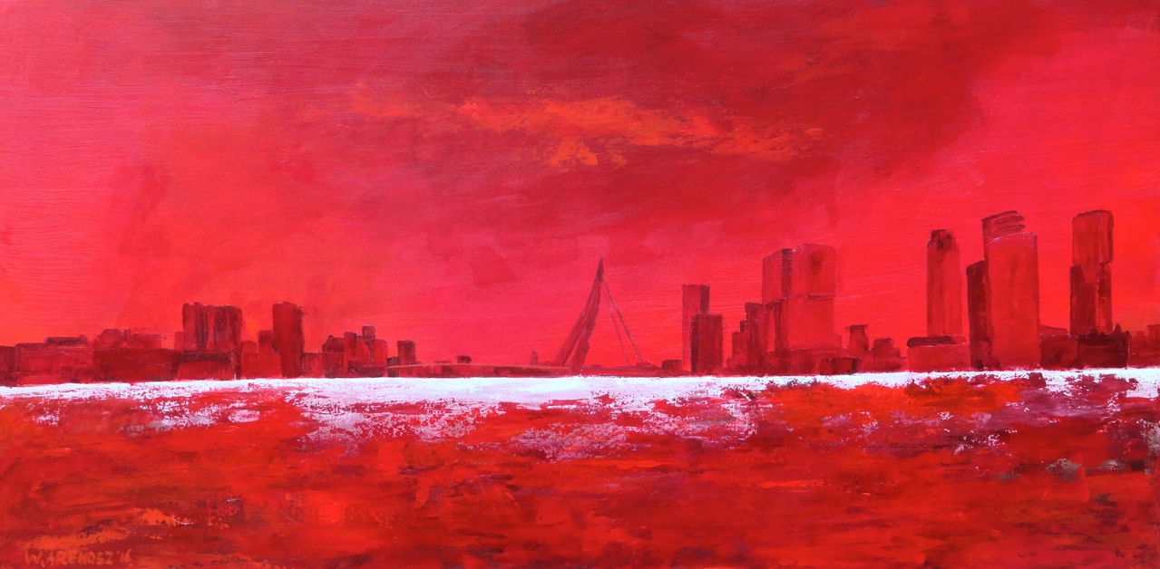 Gezicht op Rotterdam met Erasmusbrug en Kop van Zuid in Rood en Oranje
