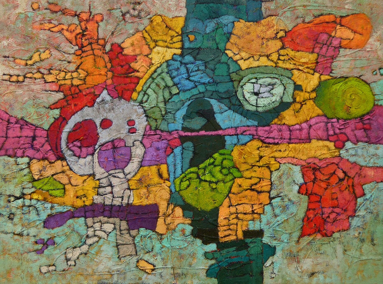 Abstracte schilderijen en dito beschilderde objecten in een stijl die ligt tussen geraffineerde eenvoud en georganiseerde chaos