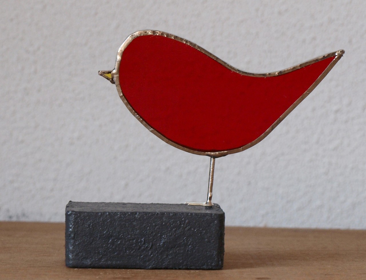 Eigenlijk mag dit natuurlijk geen roodborstje genoemd worden, maar als maker heb je vrije keus. Vogeltje van rood waterglas, op sokkeltje. Maten zijn bij benadering.