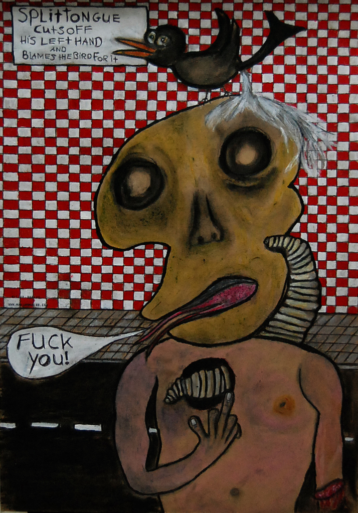SPLIT TONGUE mixed media on paper ballpoint, pencil,paint, fine liner,marker, oil pastel part of installation PLEASE TAKE IT PERSONAL 2015-2017 (installation still in progress)