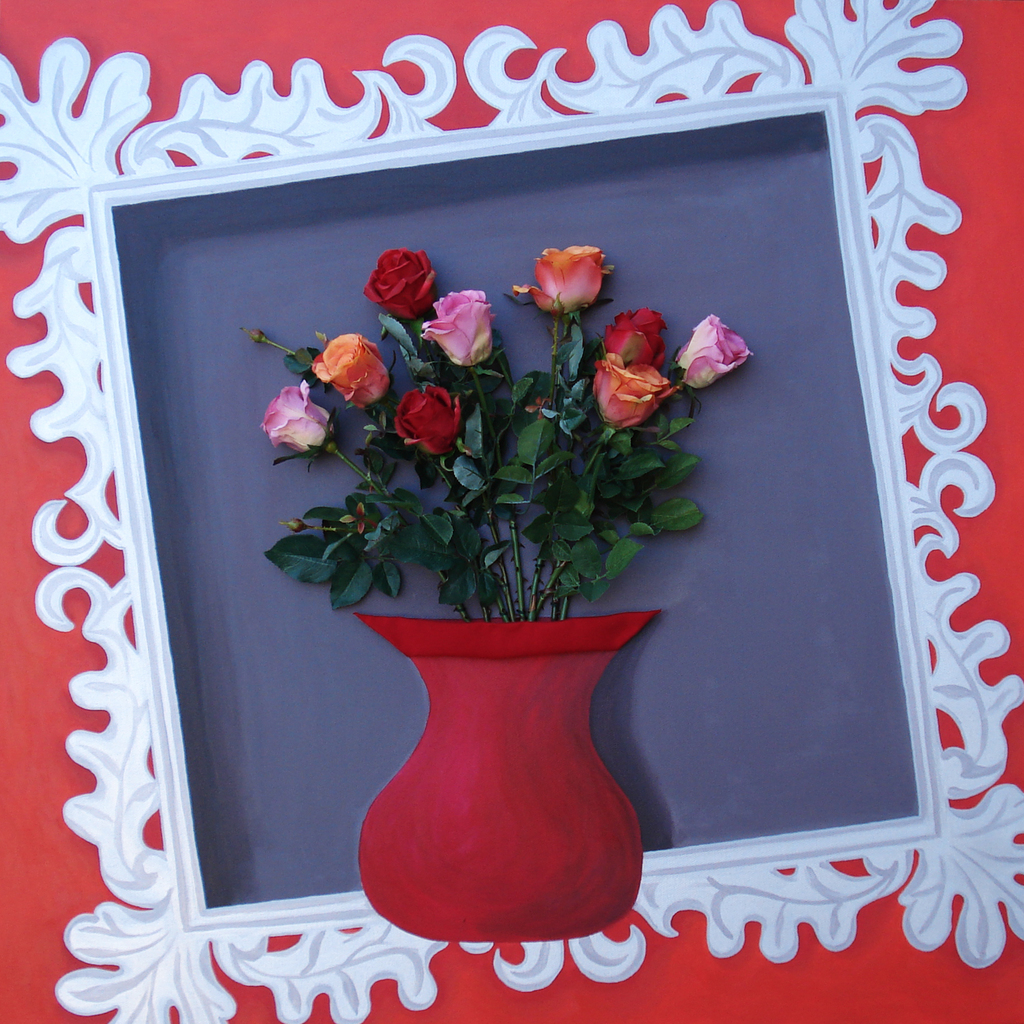 Kleurrijk schilderij met echte zijden rozen in een geschilderde baroklijst.