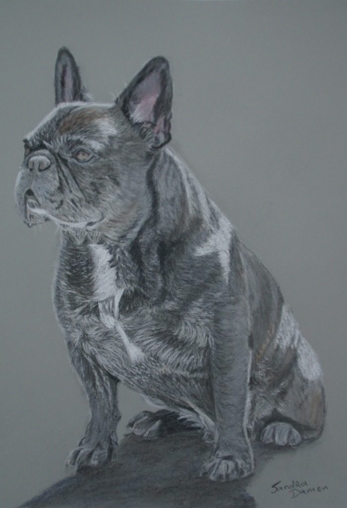Spykey is een franse buldog die ik gemaakt hebt voor een 12.5 jarig samenzijn. Deze heb ik gemaakt op mi-teintes papier, dit is een speciaal gemaakt papier voor pastel, het voelt aan als fijn schuurpapier en houdt de pastel goed vast.