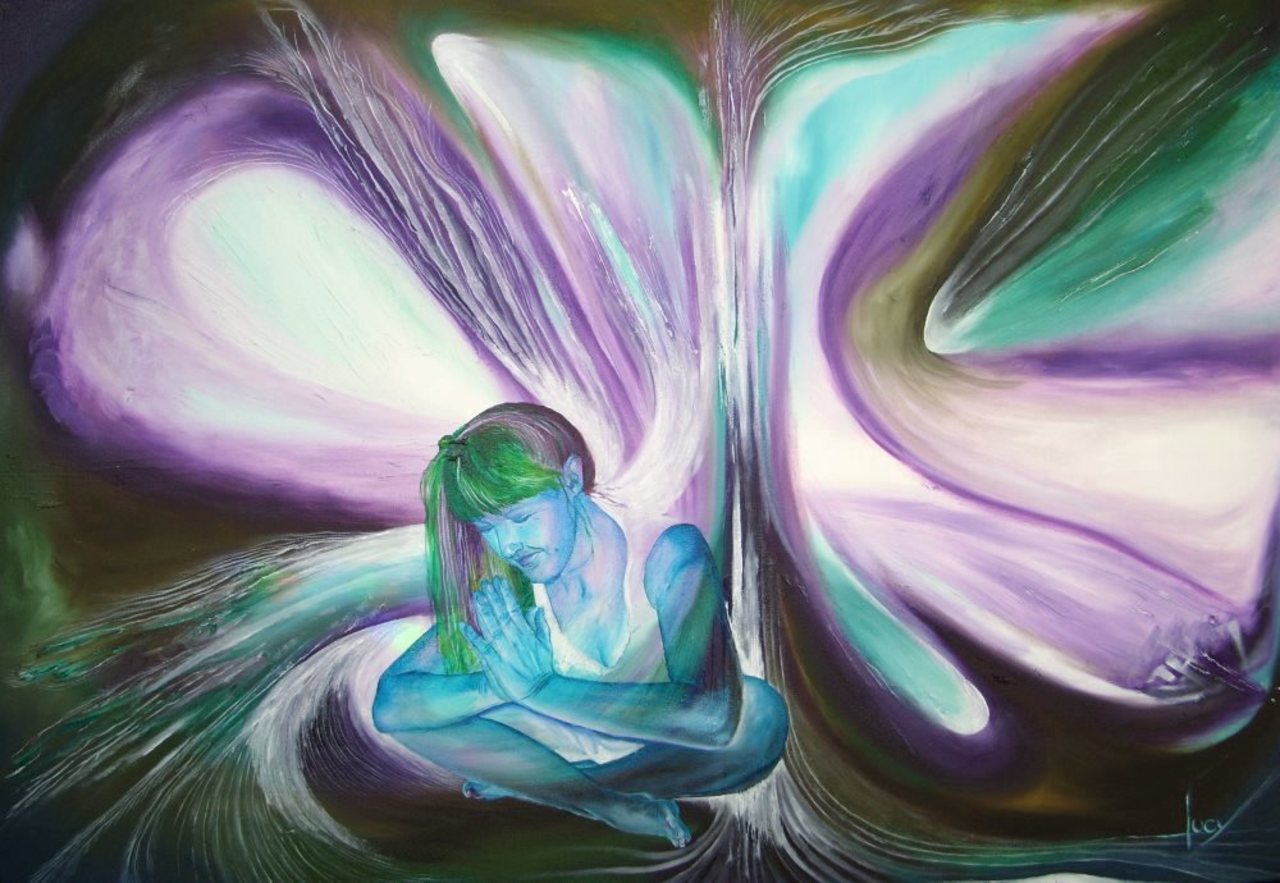 In overgave in mij . laat ik los . de uiterlijke illusie . In afstemming op mijn innerlijke ruimte . daal ik af in vloeibare vrede . en voel de grootsheid van het universum . word grenzeloos dansende energie . en smelt samen . daar waar de kosmische wind . mijn hele Wezen raakt . Waar de zachtheid van liefde . woordeloos haar nooit eindigende glimlach laat zien.