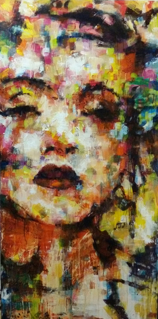 "Madonna" in haar jonge jaren, kleurrijk expressief abstract portret.