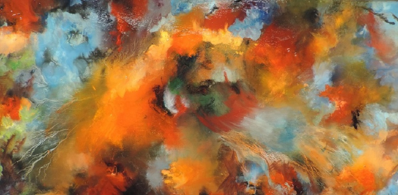 Laag op laag aanbrengen van olieverf met palletmes, gebruik van mediums om het invloeiings effect te verkrijgen en overgoten het hars