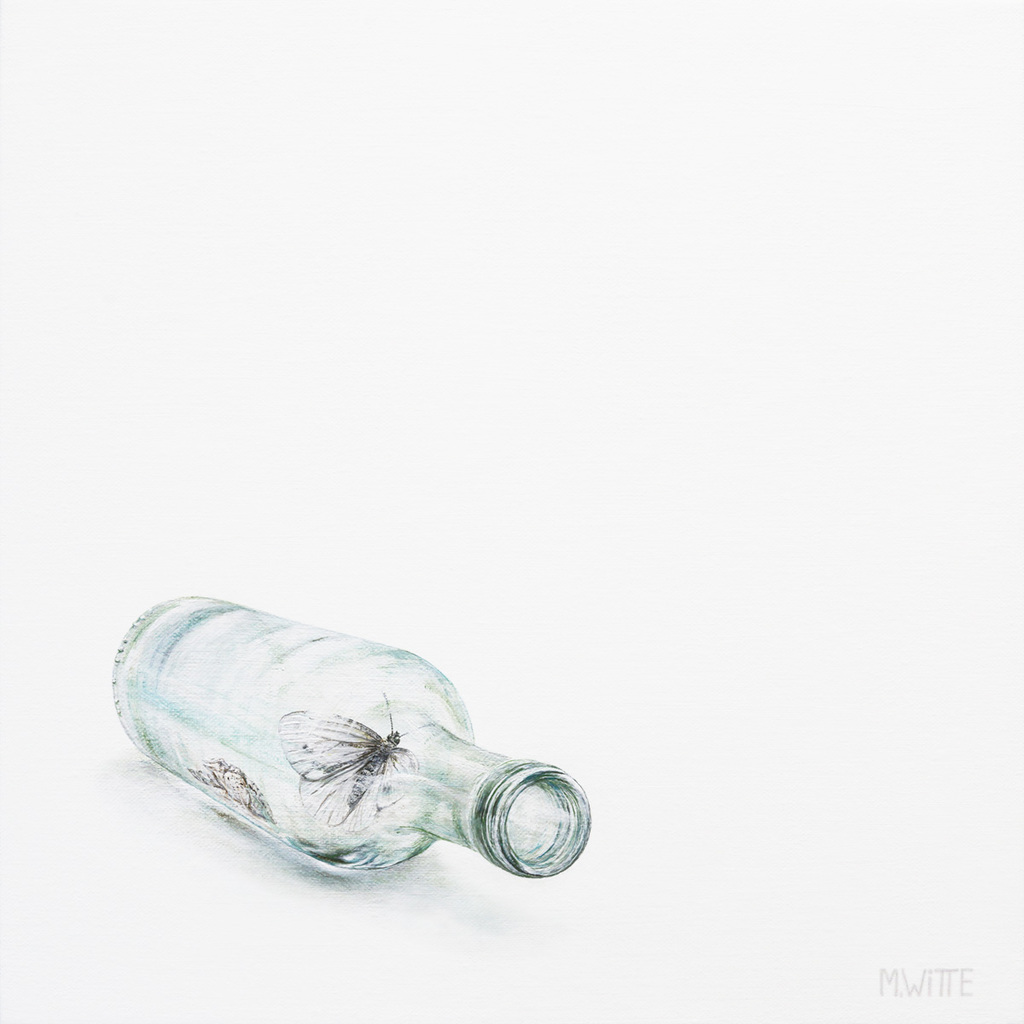 Vlinder gevangen door eigen schoonheid... Het schilderij is in 2021 aangepast. De witte vlinder is vervangen voor een kleurrijker exemplaar.