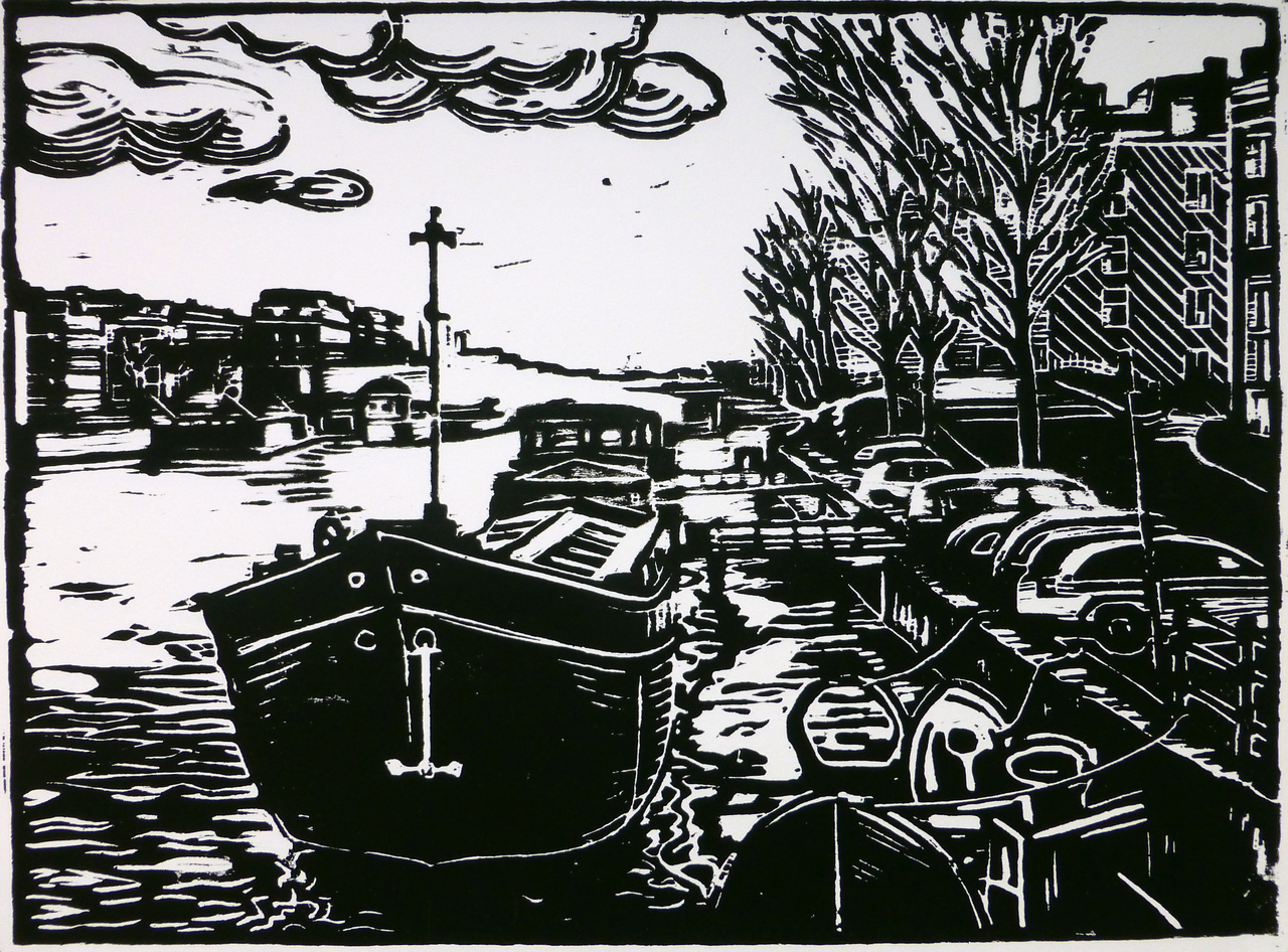 Houtsnede naar een foto van de Amstel met zicht op de Amstelschutsluis, genomen vanaf de Magere brug te Amsterdam, afgedrukt met inkt op waterbasis