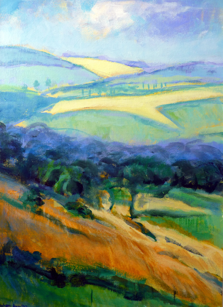 Het Geuldal in Limburg, in acryl geschilderd en geabstraheerd a.h.v. een ter plekke gemaakte aquarel tijdens een vakantie in de buurt van Mechelen.