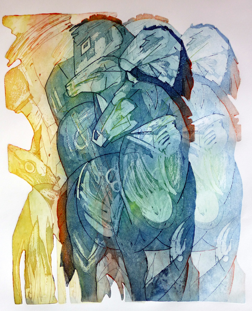 Kleurets gemaakt naar het verloren gegane schilderij "Turm der blauen Pferde" van Franz Marc. De eerdere etsplaat is verzaagd en afgedrukt in diverse kleuren in 2 drukgangen. De 2e drukgang veroorzaakt een schaduwwerking waardoor de compositie spannender wordt, mede door de blanco vlakken van het papier.