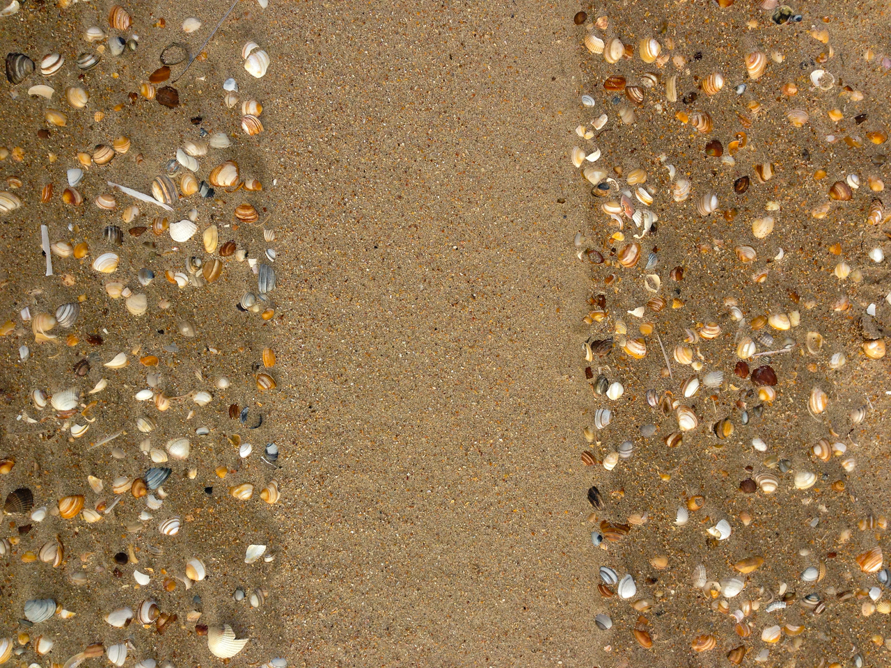 Schelpen op het strand, met baan zand ertussen. Zo gefotografeerd, niet gephotoshopt.