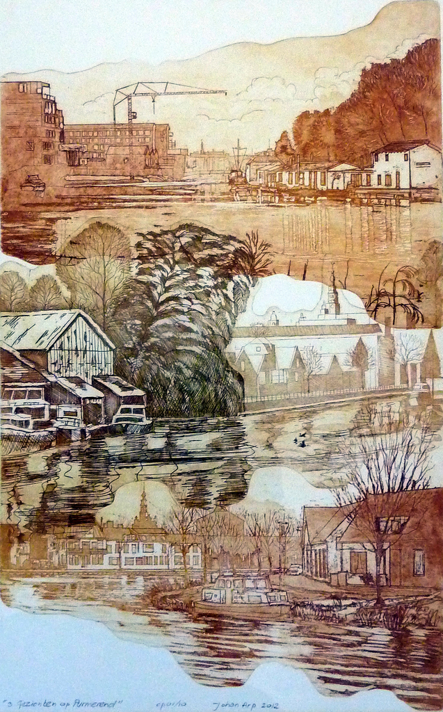 Collage techniek van 3 afzonderlijke etsplaten van stadsgezichten Purmerend met als rode draad water en zicht op het oude centrum. De etsplaten zijn ook afzonderlijk geëxposeerd in Museum Waterland Purmerend in het kader van de Expositie "Gezicht op Purmerend" in 2010.