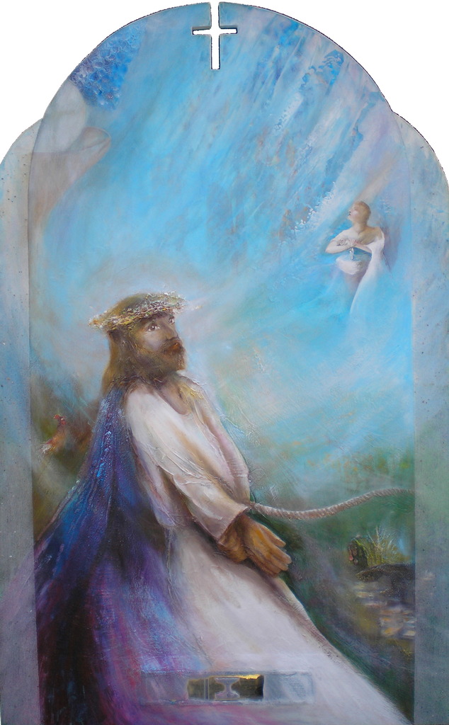 Onmacht: Soms lijkt het of iedereen tegen me is. Ik voel me onbegrepen, onrechtvaardig behandeld. Geef mij de kracht om verder te gaan. Jezus wordt ter dood veroordeeld. De haan herinnert aan het ontkennen van Petrus. De zilverlingen worden later gebruikt om ‘de bloedakker’ te kopen. Pilatus wast zijn handen in onschuld. Laat deze beker aan mij voorbijgaan….’ Jezus laat zich meevoeren, maar omdat hij deze taak als mens op zich heeft genomen voelt hij zich opstandig (gebalde vuist) en onbegrepen. Mattheus 27:1 Markus 15:15 Lukas 23:25 Johannes 19,16