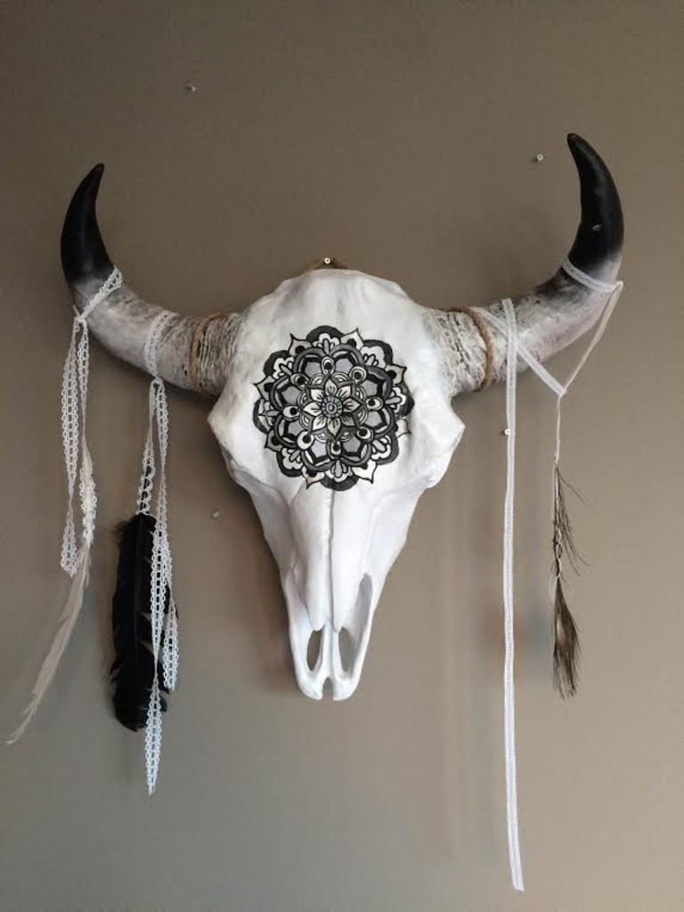 Hand beschilderde buffelschedel. Volledig skull naar wens beschilderd