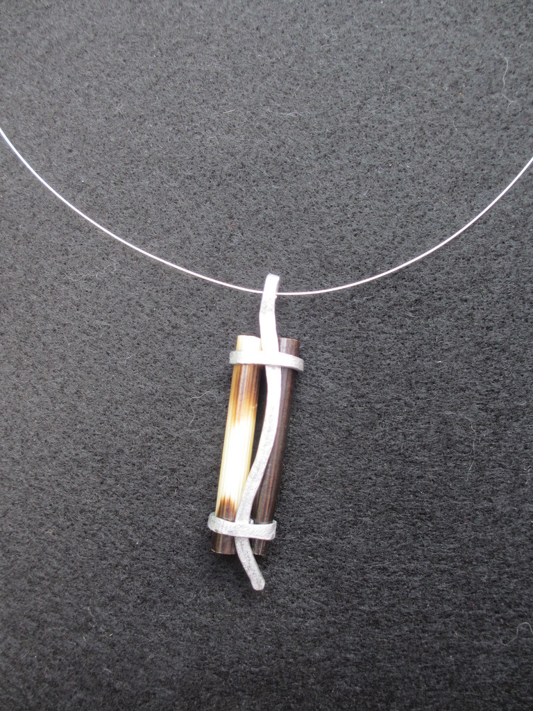 Janny heeft tijdens een bezoek aan Zuid Afrika een aantal pennen van een stekelvarken gekregen. Fraai materiaal dat uitnodigt tot experimenteren. Belangrijk is wel om de venijnige punt weg te werken. In dit geval is de pen in stukken gezaagd en met behulp van geslagen aluminium tot een setje gemaakt. Een kunststof spang maakt het compleet. De hanger kan aan beide zijden gedragen worden.