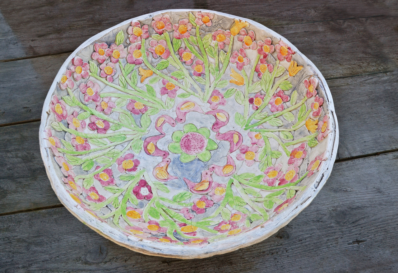 Schaal: ingelegd met bloemen en vogels, paperclay, oxydes, mat glazuur, gebakken op 1100 graden