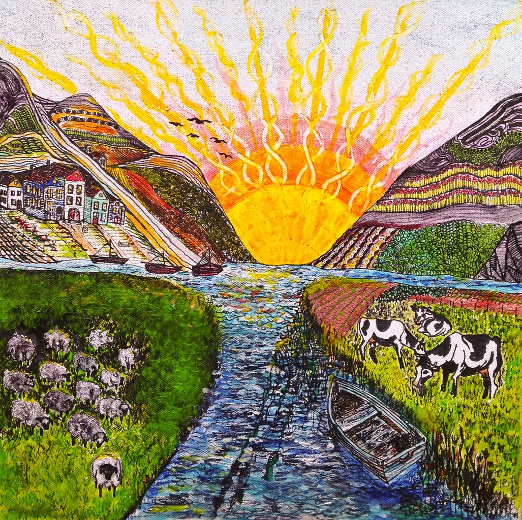 Zon Water Kleurrijk Natuur Koeien Schapen Zentangle