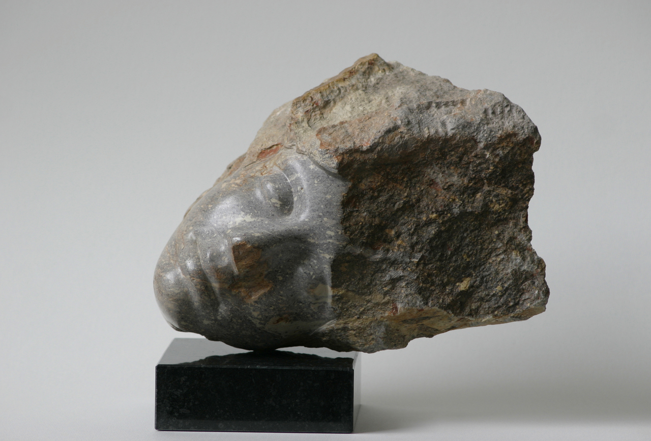 Een slapend hoofd in kobalt serpentijn op een hardstenen sokkel.