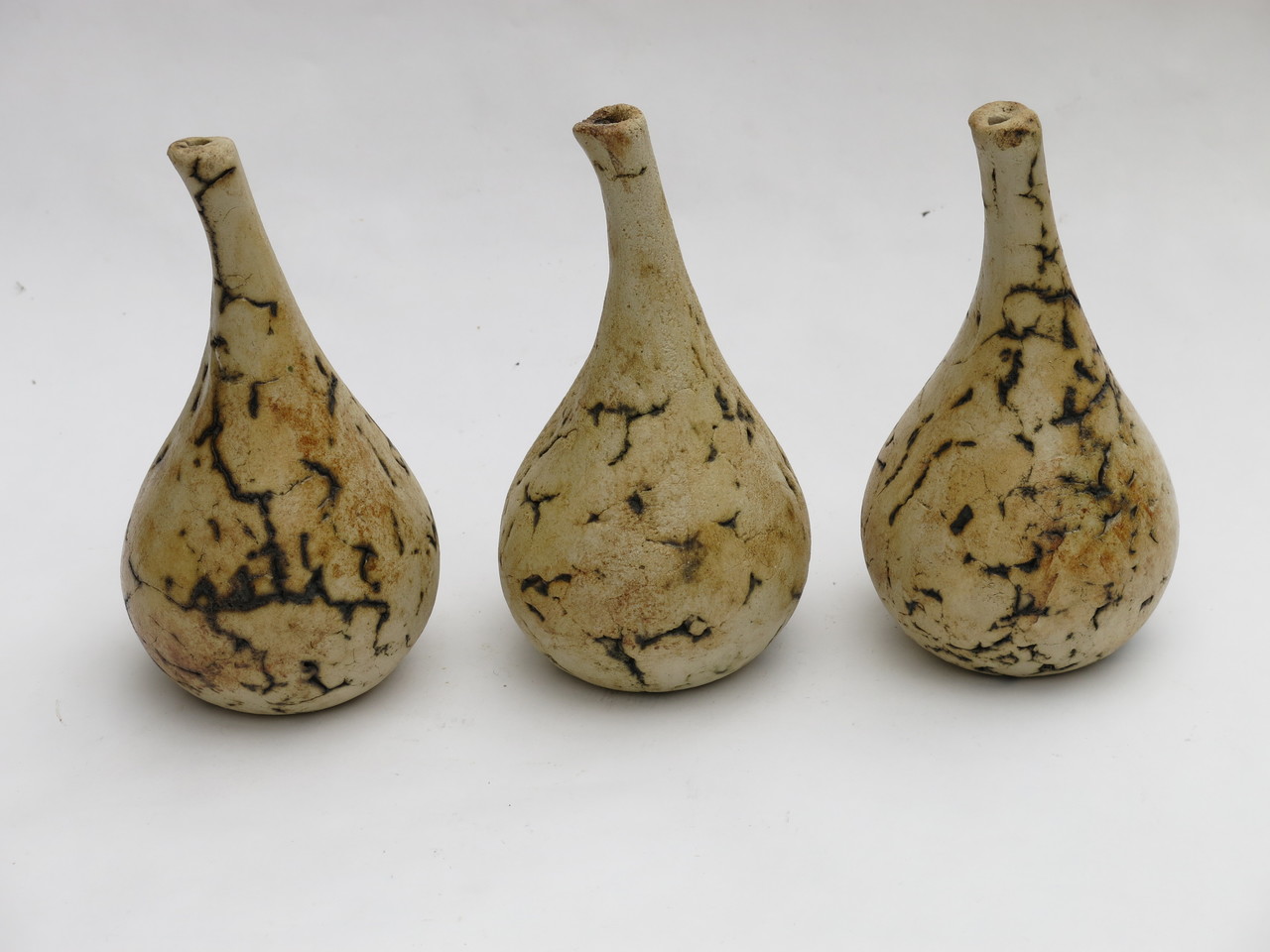 3 vaasjes, gemaakt van grove chamotte klei, met oxides.