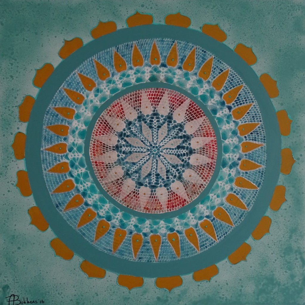 Mandala met oker geel en turquoise