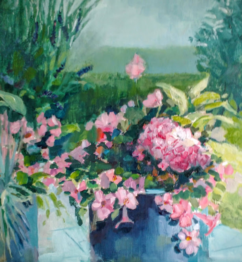 Op mijn terras staat deze prachtige plantenbak. Elke dag geniet ik ervan. En nu nog wat langer. 40 bij 40 in olieverf