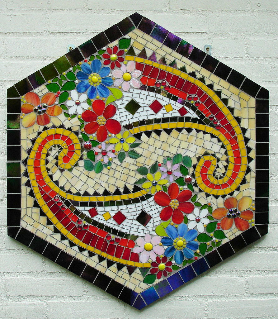 Mozaïekwerkstuk gemaakt van glasstukjes.