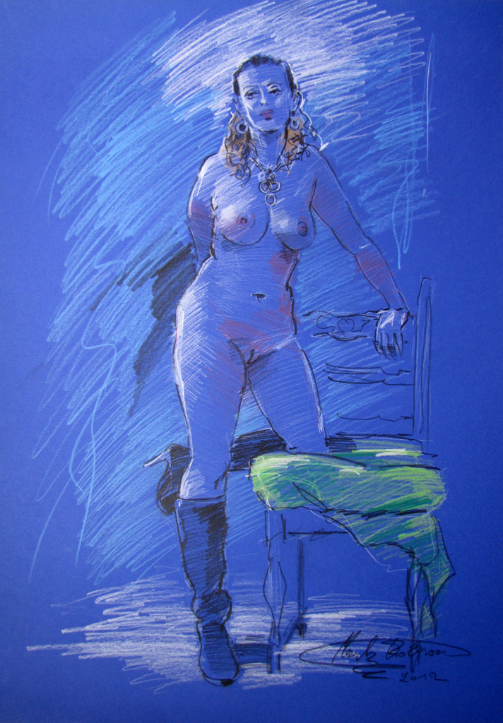 Studie naar charmant naaktmodel op blauw papier - Model: de gedreven Miss J - Pastelpotlood op Cansonpapier