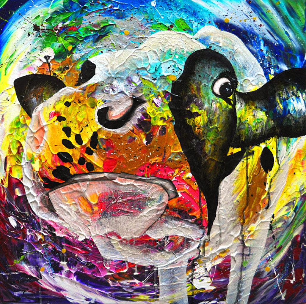 VERKOCHT. Kleurrijk koeienschilderij. Achtergrond acrylverf en de koe in olieverf. 50x50x4cm.