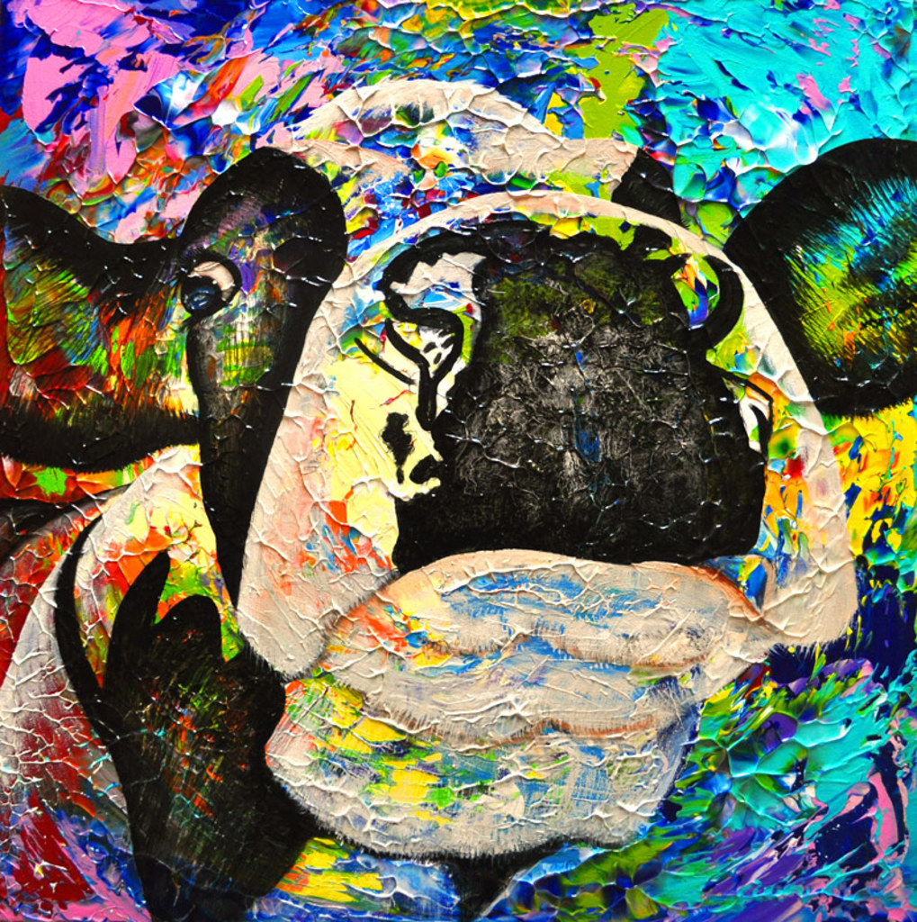VERKOCHT. Kleurrijk koeienschilderij. Achtergrond acrylverf en de koe in olieverf. 60x60x4cm.