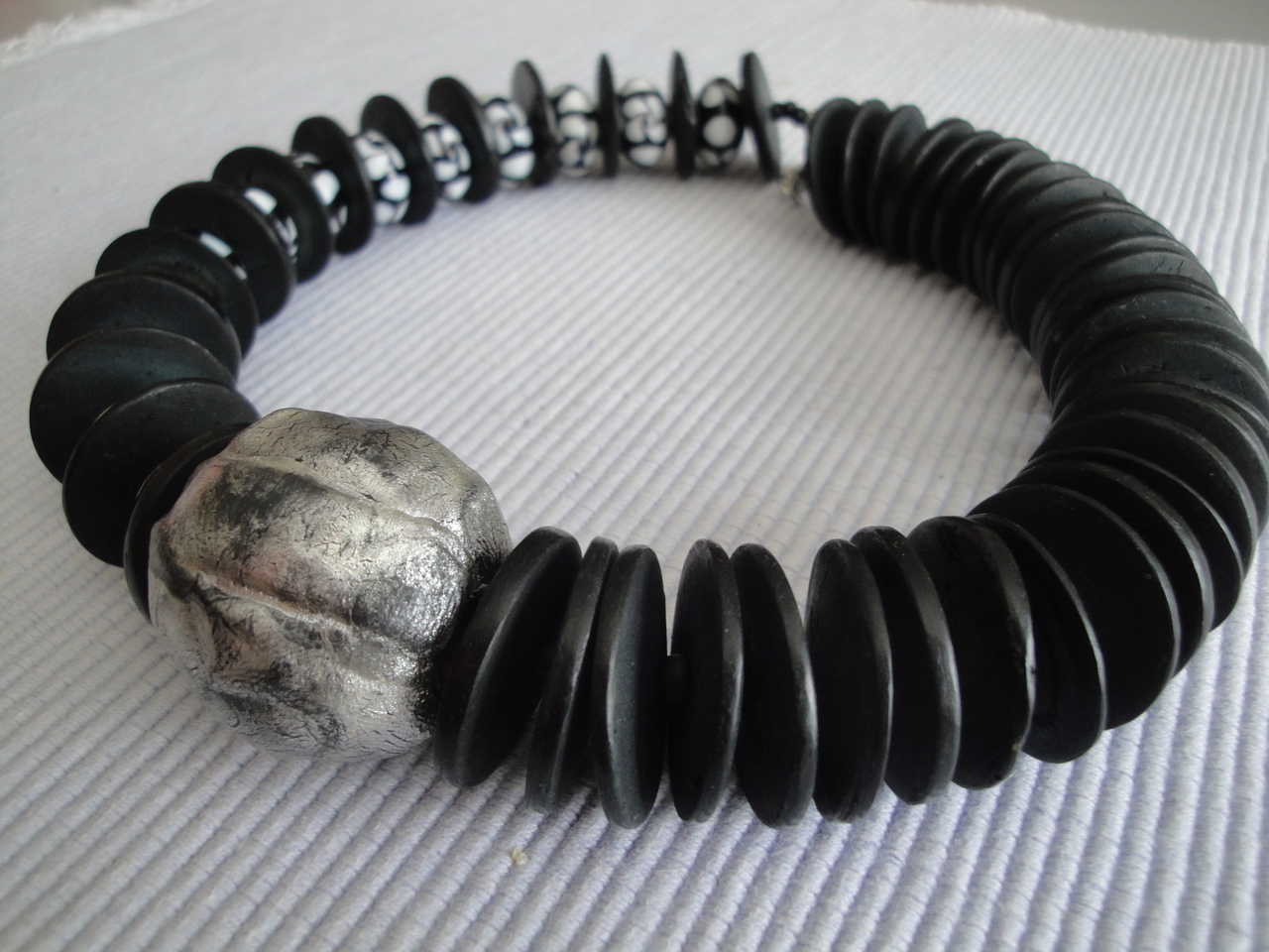 asymetrisch zwartwit halssieraad; ovale zwartwitte glaskralen en zwarte schijfjes van cocosnootbast; grote kunststof kraal in het midden (doorsnede 3,5 cm); lengte ongeveer 46 cm, gewicht 150 gr