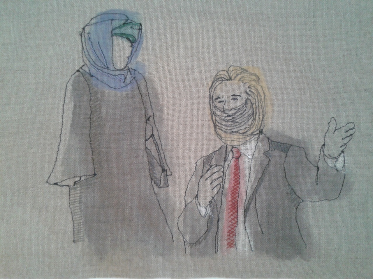 Tijdens het bezoek van de koningin aan de Arabische Emiraten was Wilders zeer gebolgen over het feit dat de koningin een hoofddoek droeg bij het bezoeken van een moskee. Hier Wilders afgebeeld met zoveel haar dat hij zijn eigen haar kan gebruiken als hoofddoek.