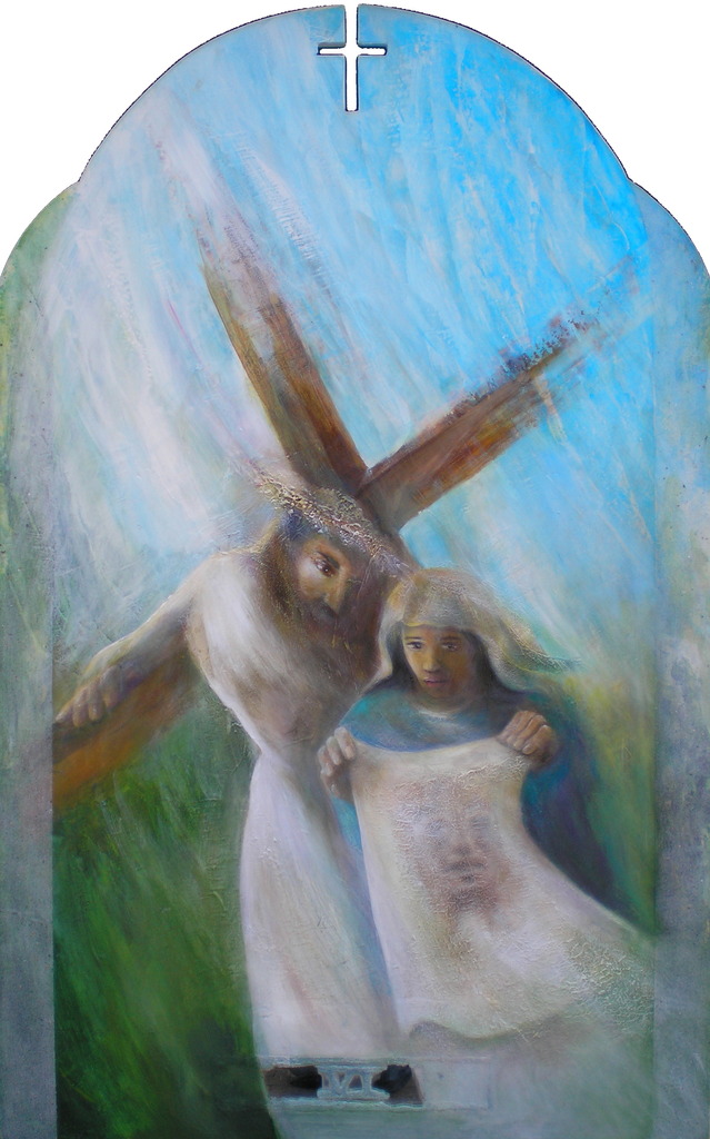 Veronica Getroost worden, een afdruk van Liefde. Veronica droogt het gezicht van Jezus af. Veronica heeft Jezus een doek aangereikt en ziet ‘een blijvend’ gelaat. Zij is mysterieus en van oosterse afkomst. Hoe graag zouden ook wij iets blijvends willen hebben; iets tastbaars.