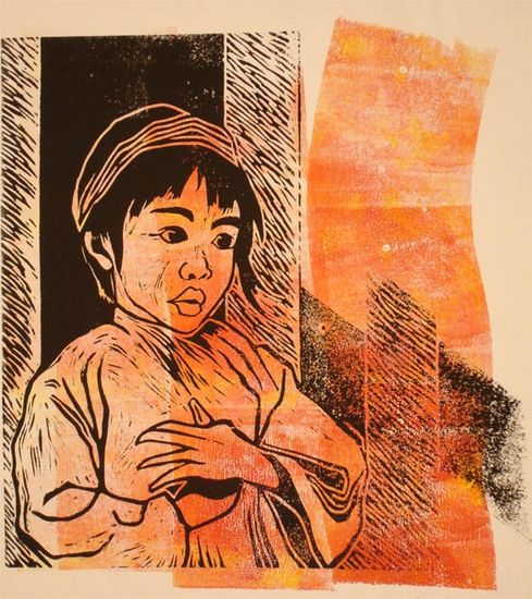 Lino gemaakt naar aanleiding van de tsunami. Afmetingen 50 x 65cm.