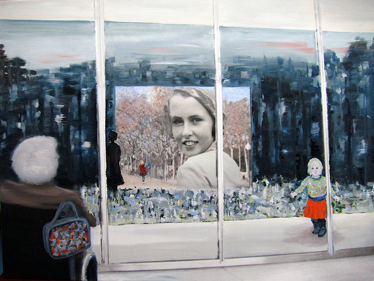Looking back twice is het moederwerk in de serie Looking back, Looking back twice en Silence. De serie gaat over herinnerde beelden die over de actualiteit heen schuiven en haar vertekenen. Ik noem dit werk een cross-over omdat fotografie opdoek overgaat in olie op doek.