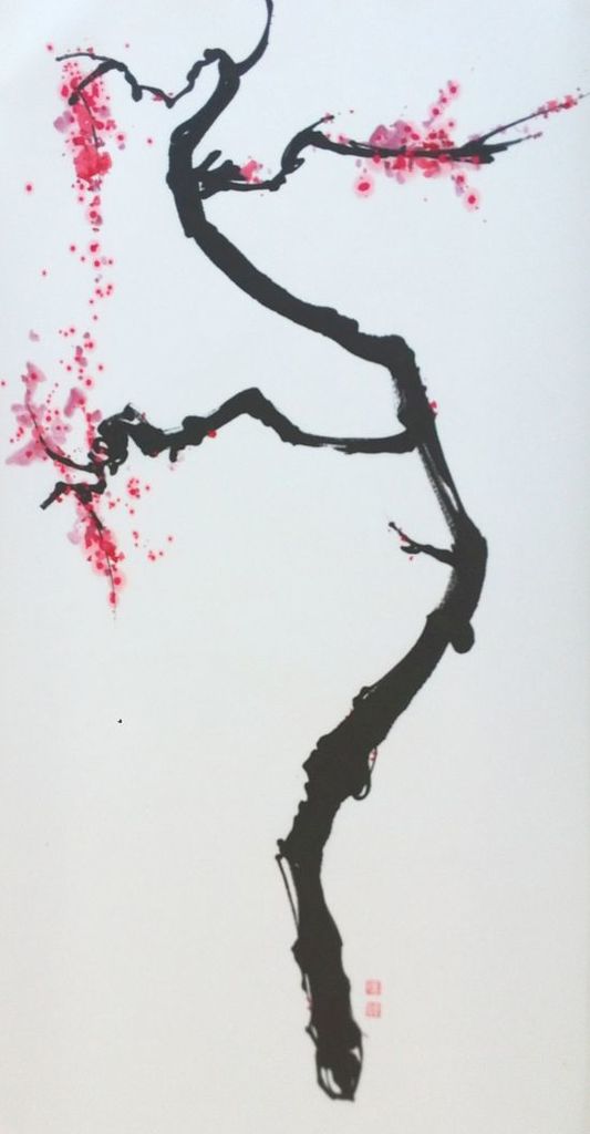 Tak met rode en roze bloesem, in lijst